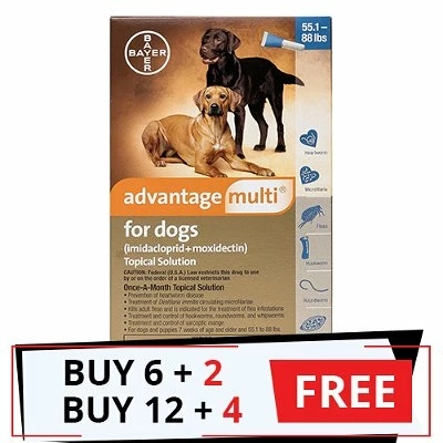Advantage Multi Blue is a broad-spectrum, monthly spot-on treatment for dogs. It helps kill and control fleas, gastrointestinal worms (hookworm, roundworm and whipworm), sarcoptic mange in canines. The topical treatment is also effective in controlling heartworm infection. Advantage Multi is also known as Advocate, which is one the most efficacious five-in-one parasite treatment for mixed parasitic infections. It is formulated in four different pack variants for various dog sizes. This Blue colored pack of Advantage Multi 55.1-88 lbs for Extra Large Dogs is specifically designed for puppies weighing 55.1 to 88 pounds (25-40 kg). It is available in 3, 6 and 12 monthly supply pack.