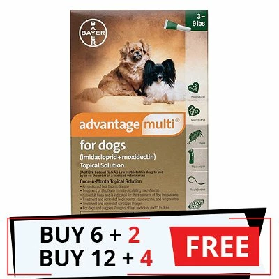 Advantage Multi Green is a broad-spectrum, monthly spot-on treatment for dogs. It helps kill and control fleas, gastrointestinal worms (hookworm, roundworm and whipworm), sarcoptic mange in canines. The topical treatment is also effective in controlling heartworm infection. Advantage Multi is also known as Advocate, which is one the most efficacious five-in-one parasite treatment for mixed parasitic infections. It is formulated in four different pack variants for various dog sizes. This Green colored pack of Advantage Multi 3-9 lbs for Small Dogs and Puppies is specifically designed for puppies weighing 3 to 9 pounds (1.3 kg – 4 kg). It is available in 3, 6 and 12 monthly supply pack.