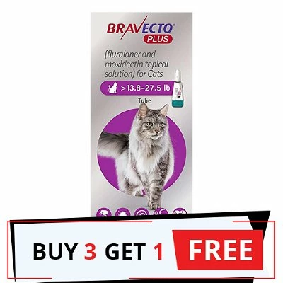 This powerful prevention formula is made using two key ingredients: fluralaner and moxidectin. Each tube of Bravecto Plus (Purple Pack) contains 500 mg of Fluralaner per tube and 25 mg of Moxidectin per tube, which keeps internal and external parasites at the bay. Bravecto Plus Purple is effective in cats older than 6 months of age, weighing between 13.75 to 27.5 lbs (6.25 – 12.5 kg).