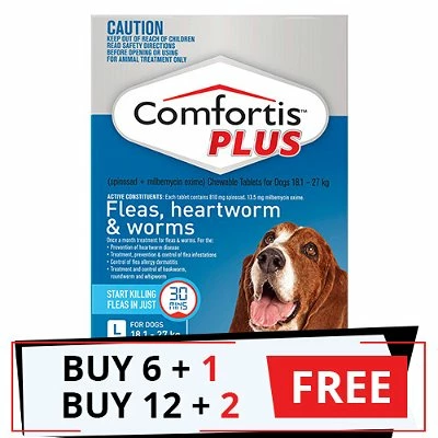Comfortis Plus is easy to dose chewable flea and worm control treatment for large dogs. The advanced version of Comfortis, Comfortis Plus not only destroys fleas but also controls heartworms and various intestinal worms. The oral treatment starts working within a few hours and kills adult fleas before they lay eggs. It prevents flea infestations and aids in the treatment program of flea allergy dermatitis. The monthly treatment aids in the prevention of heartworm disease and treats intestinal worms. The tasty chewable tablet is easy to dose and has no side effects on monthly treatment. It is safe for dogs and puppies above 8 weeks of age & bodyweight 5lbs (2.3 kg) or greater.