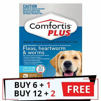 Comfortis Plus is easy to dose chewable flea and worm control treatment for Extra large dogs. The advanced version of Comfortis, Comfortis Plus not only destroys fleas but also controls heartworms and various intestinal worms. The oral treatment starts working within a few hours and kills adult fleas before they lay eggs. It prevents flea infestations and aids in the treatment program of flea allergy dermatitis. The monthly treatment aids in the prevention of heartworm disease and treats intestinal worms. The tasty chewable tablet is easy to dose and has no side effects on monthly treatment. It is safe for dogs and puppies above 8 weeks of age & bodyweight 5lbs (2.3 kg) or greater.