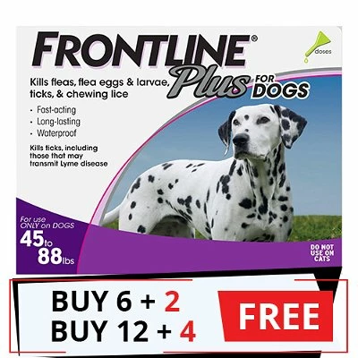Frontline Plus for large dogs is a topical flea and tick treatment for 8 weeks and older dogs that weigh between 45-88 lbs. The monthly treatment kills adult fleas, flea eggs & larvae, adult ticks, and chewing lice. The spot-on formula for dogs kills fleas within 12 hours and eliminates ticks as well as chewing lice within 48 hours of administration.