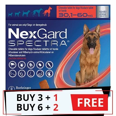 NexGard Spectra red for extra large dogs is a beef-flavored chewable that is highly effective in treating and preventing fleas, ticks, intestinal worms, as well as heartworm disease. It is available in five different pack sizes as a soft, chewable tablet with a beef flavor. NexGard Spectra red extra large dog pack is designed specifically for dogs weighing between 66 to 132 lbs. It controls flea infestation in dogs for 5 weeks, tick infestation for 4 weeks.