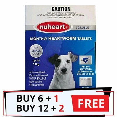 Nuheart up to 24 lbs is a monthly heartworm preventive tablet for dogs. It is the generic version of Heartgard but more cost-effective than the original treatment. It contains the same ingredient as Heartgard – Ivermectin, with the same dose. Recommended for puppies at least 6 weeks of age, this oral tablet is a highly recommended treatment for heartworm prevention in small dogs & puppies. It is very easy to administer due to its meat flavor property that makes dogs easily accept the tablet (Up to 11 kg).