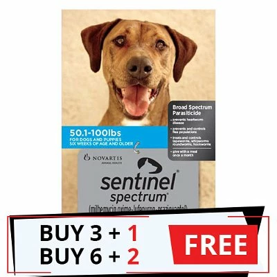 Sentinel Spectrum blue is a broad spectrum monthly oral preventative for large dogs. It is indicated for the prevention of heartworm disease. It is also formulated to help prevent and control flea populations, and for the treatment and control of adult roundworm, hookworm, whipworm, and tapeworm infections in dogs and puppies six weeks of age and older and weighing at least two pounds. The treatment is formulated in a tasty beef flavored chewable tablets and it is available in four different pack sizes. This blue large dog pack is designed specifically for dogs weighing between 50.1 to 100lbs. It is a combination of three potent active ingredients that helps protects against both internal and external parasites. In addition, Sentinel Spectrum chewable controls flea populations by breaking the flea lifecycle in both the egg and larval stages. It is a safe and suitable treatment recommended for large dogs over 6 weeks of age (22-45kg).