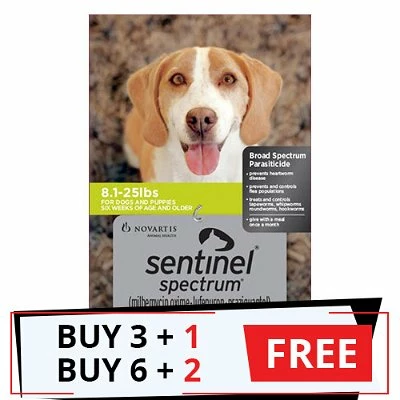Sentinel Spectrum green is a broad spectrum monthly oral preventative for small dogs. It is indicated for the prevention of heartworm disease. It is also formulated to help prevent and control flea populations, and for the treatment and control of adult roundworm, hookworm, whipworm, and tapeworm infections in dogs and puppies six weeks of age and older and weighing at least two pounds. The treatment is formulated in a tasty beef flavored chewable tablets and it is available in four different pack sizes. This green Samll dog pack is designed specifically for dogs weighing between 8.1 to 25 pounds. It is a combination of three potent active ingredients that helps protects against both internal and external parasites. In addition, Sentinel Spectrum chewable controls flea populations by breaking the flea lifecycle in both the egg and larval stages. It is a safe and suitable treatment recommended for small dogs and puppies over 6 weeks of age (4-11 kg).