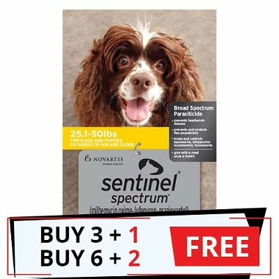 Sentinel Spectrum yellow is a broad spectrum monthly oral preventative for medium dogs. It is indicated for the prevention of heartworm disease. It is also formulated to help prevent and control flea populations, and for the treatment and control of adult roundworm, hookworm, whipworm, and tapeworm infections in dogs and puppies six weeks of age and older and weighing at least two pounds. The treatment is formulated in a tasty beef flavored chewable tablets and it is available in four different pack sizes. This yellow medium dog pack is designed specifically for dogs weighing between 25.1 to 50 pounds. It is a combination of three potent active ingredients that helps protects against both internal and external parasites. In addition, Sentinel Spectrum chewable controls flea populations by breaking the flea lifecycle in both the egg and larval stages. It is a safe and suitable treatment recommended for medium dogs over 6 weeks of age (11-22 kg).