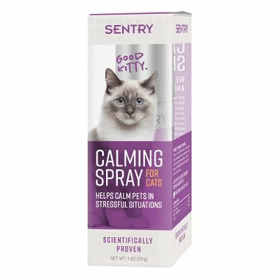 Sentry Calming Spray mimics the pheromones mother cat produces to relax and comfort her kitten. It helps ease behaviors induced by loud noises, travel, new people, separation anxiety, travel, and multi-pet household stress.